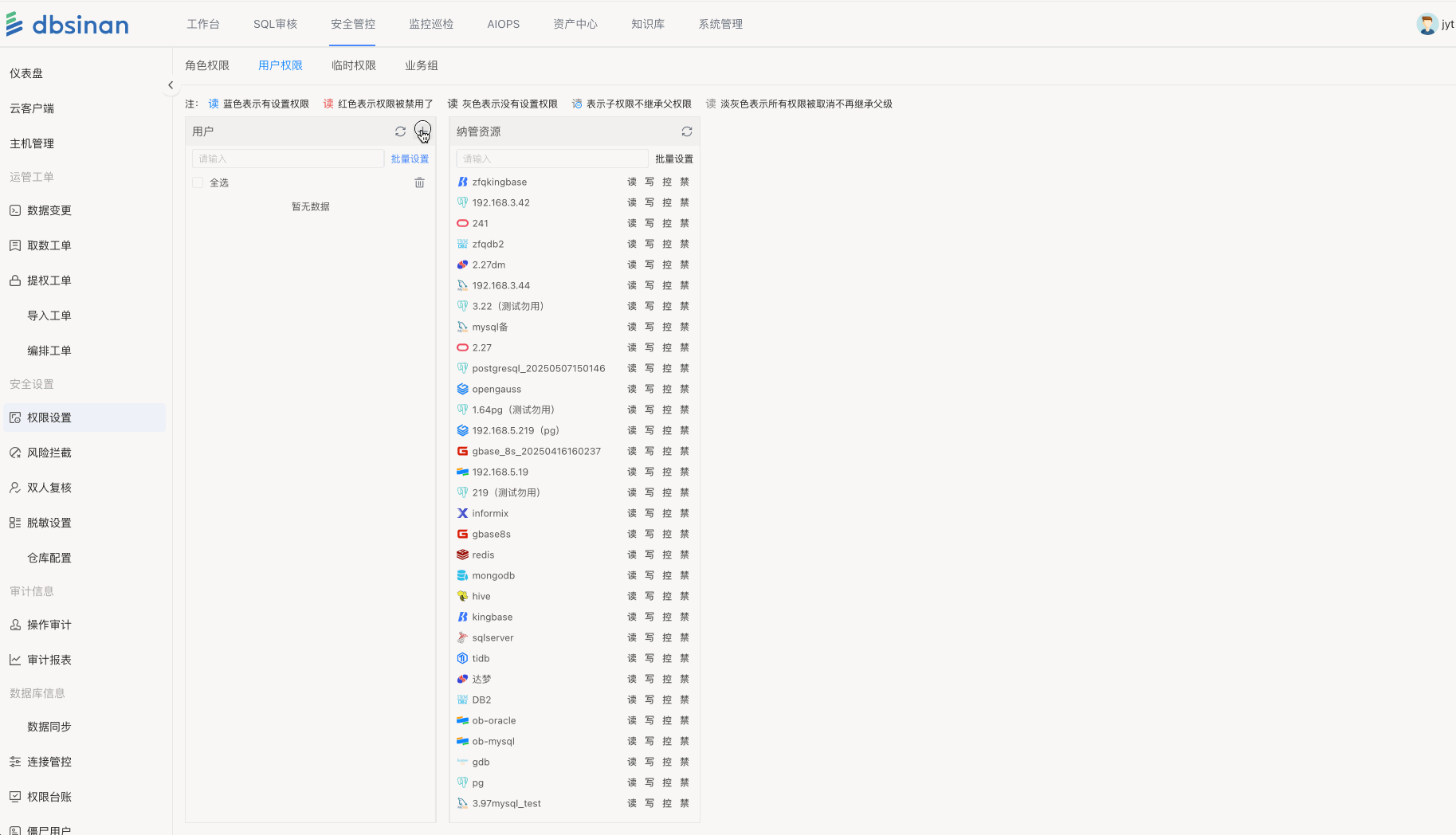 | 权限类型 | 读权限:select、查询行数、导出、单次导出行数、脱敏数据查看等级 写权限:DML 控权限:DDL/DCL权限+云客户单左侧操作按钮(命令行、切换账号)+结果集复制权限 |