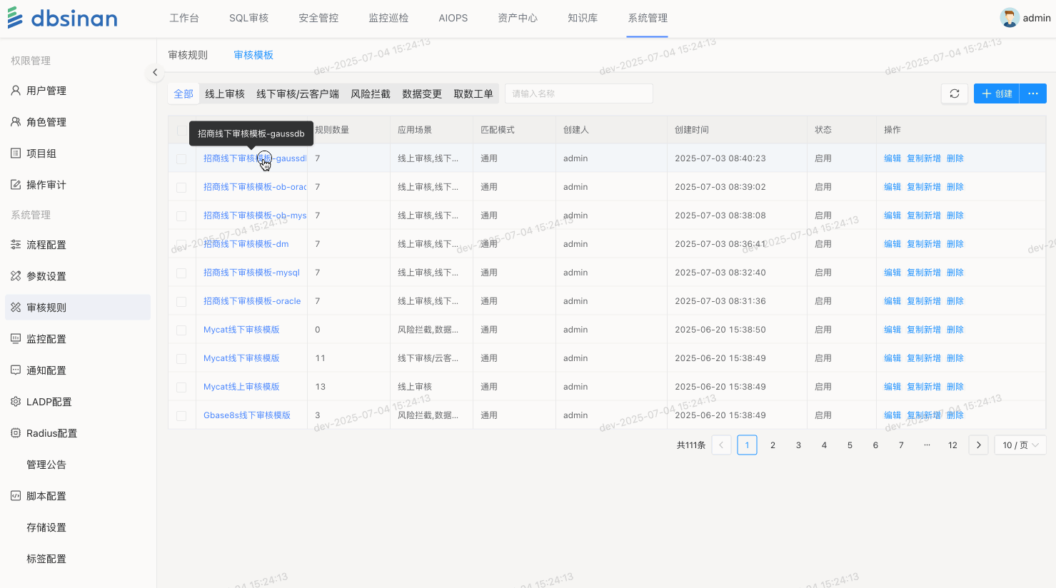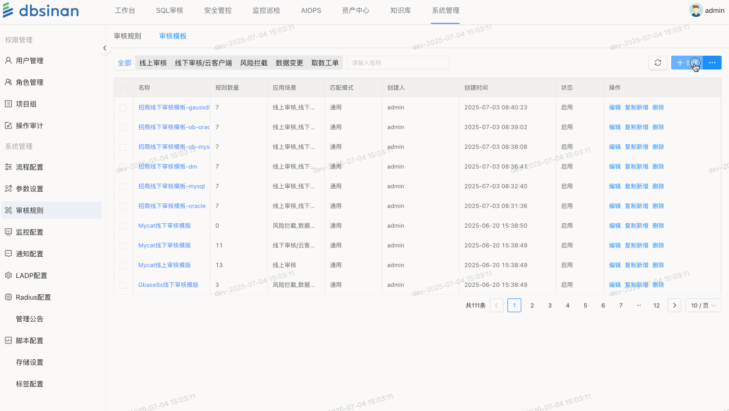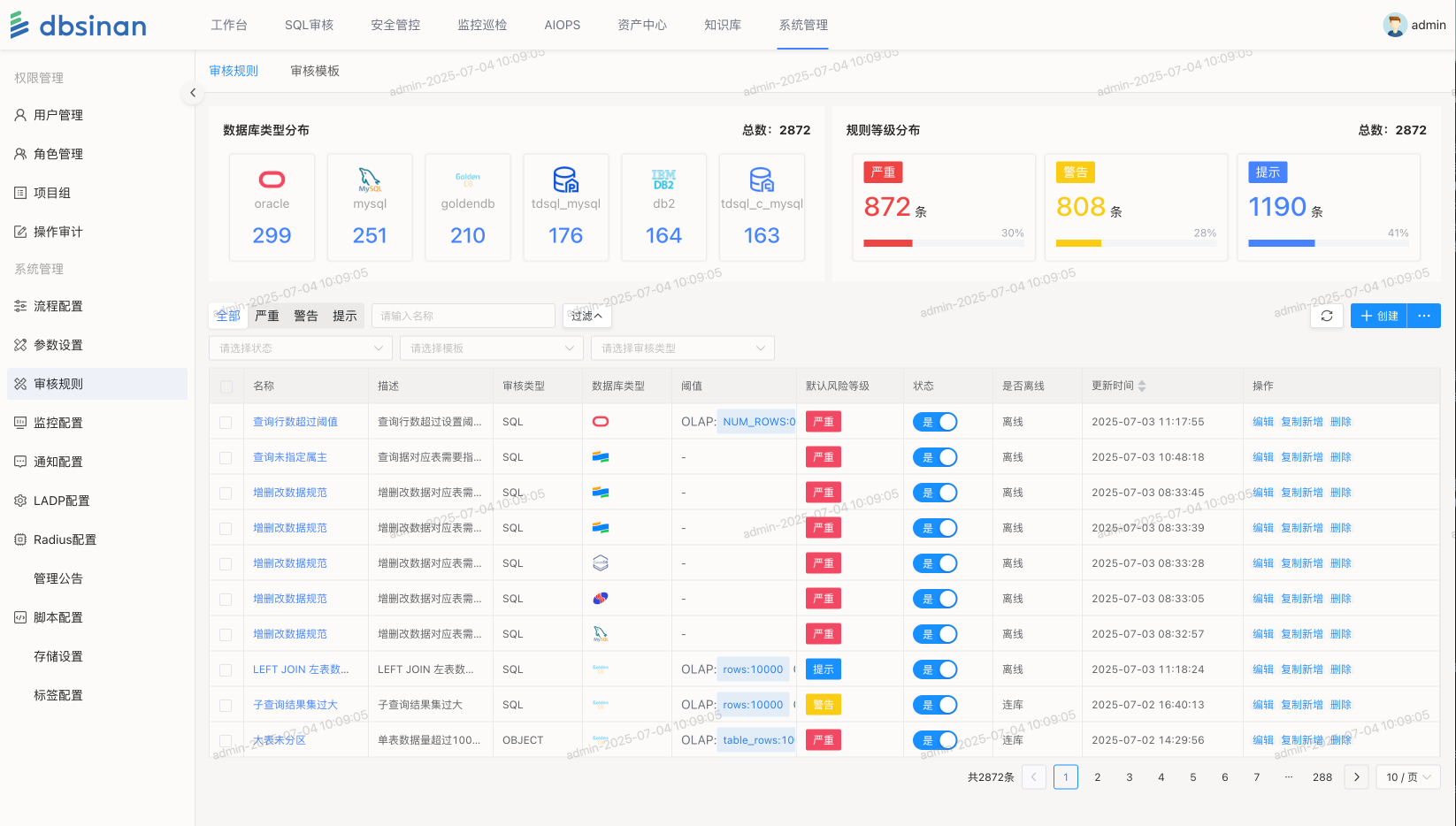 2、单击【系统管理】-【审核规则】,进入审核规则页面,可见司南内置上千条数据库审核规则。