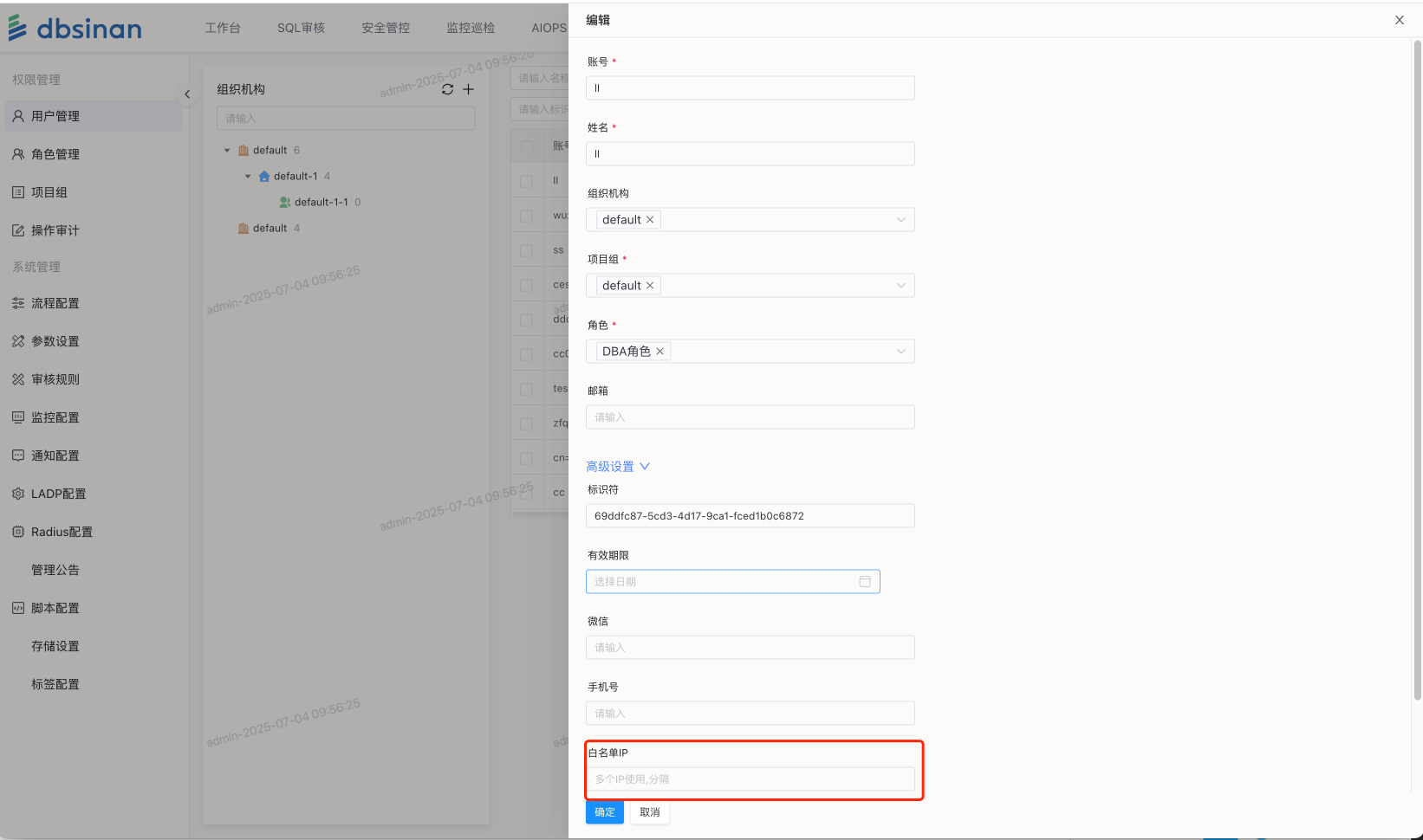 3、选中要编辑的用户,点击"编辑"按钮,打开编辑页面,点开高级设置,白名单IP输入框中,填入可登录的IP即设置成功