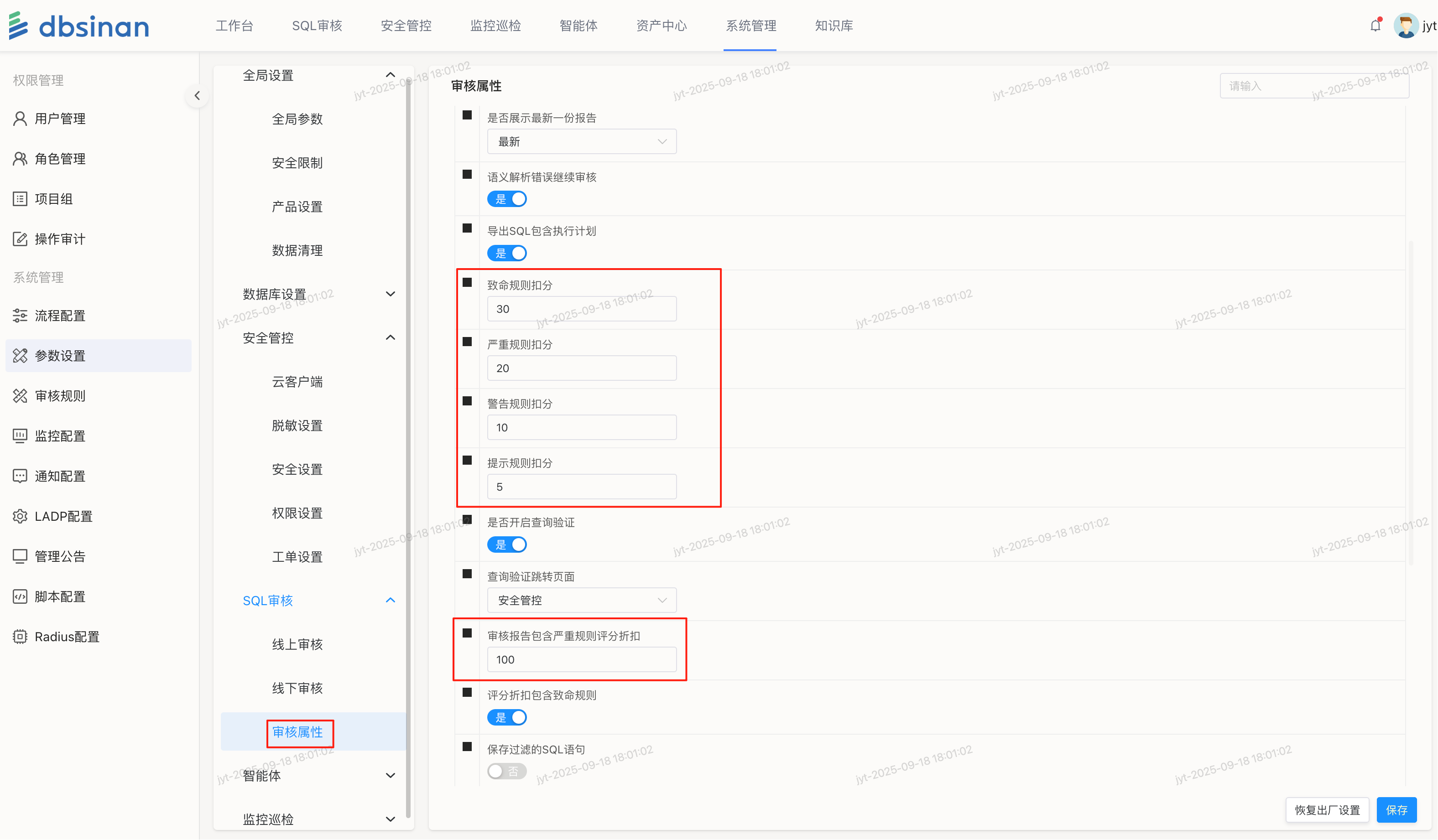 - 规则扣分明细在【系统管理】-【参数设置】-【SQL审核】-【审核属性】里设置